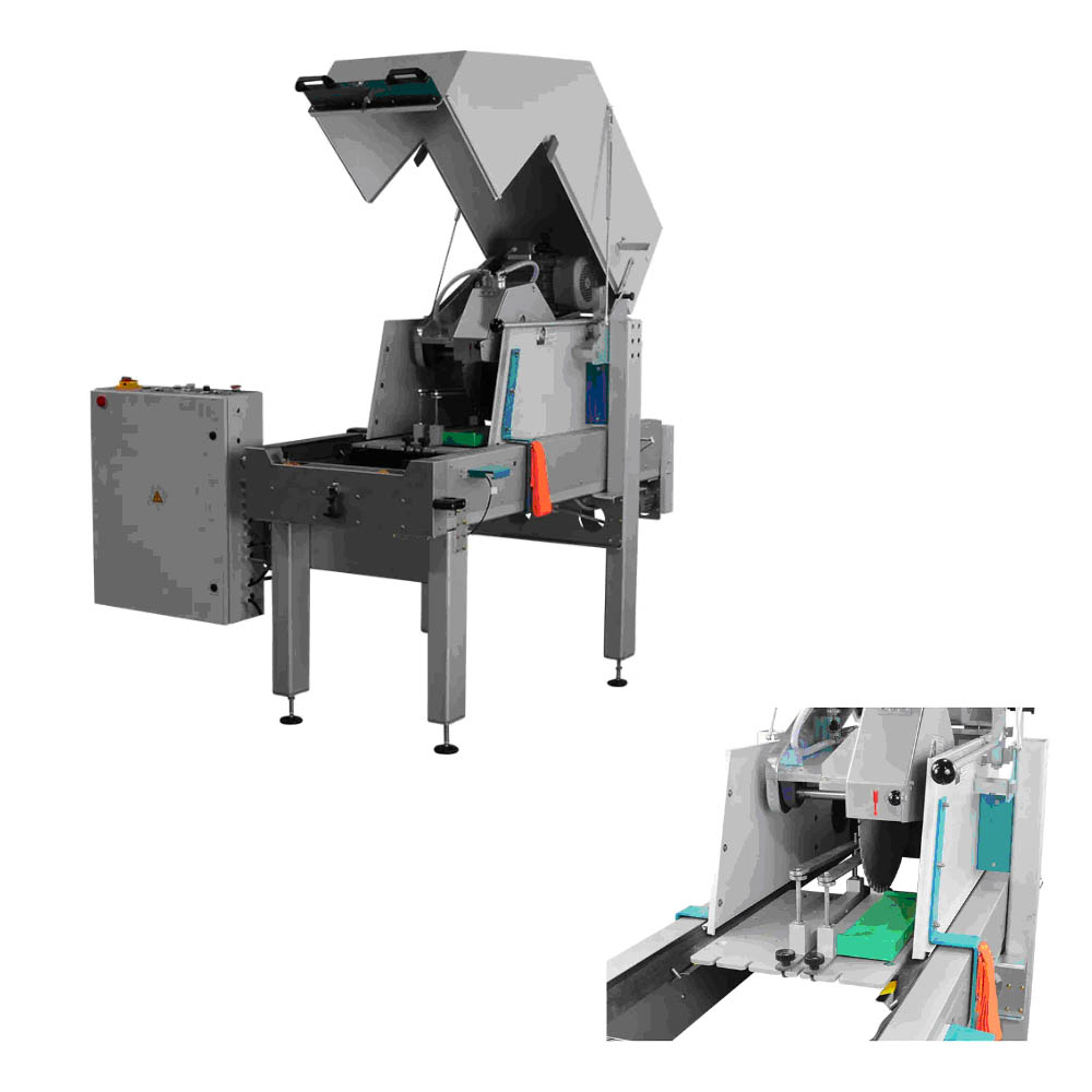Levereras med skärhuvud för diamantsågblad 450 mm dia. Vid behov kan ett andra diamantsågblad fästas med varierande avstånd från 25 till 60 mm. Denna installation är lämplig för att skära särskilt prismatiska prover ur provplattor upp till 410 x 260 x 120 mm.