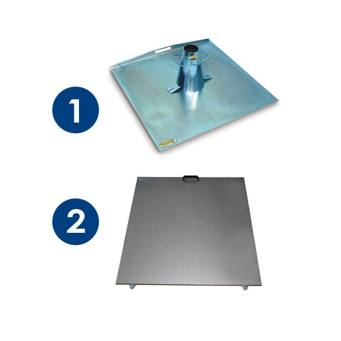 Produktinformation: Platta i galvaniserad plåt , dimension 900×900 mm, med två graverade cirklar om diam 210 and 500 mm och ett centrerat kryss.