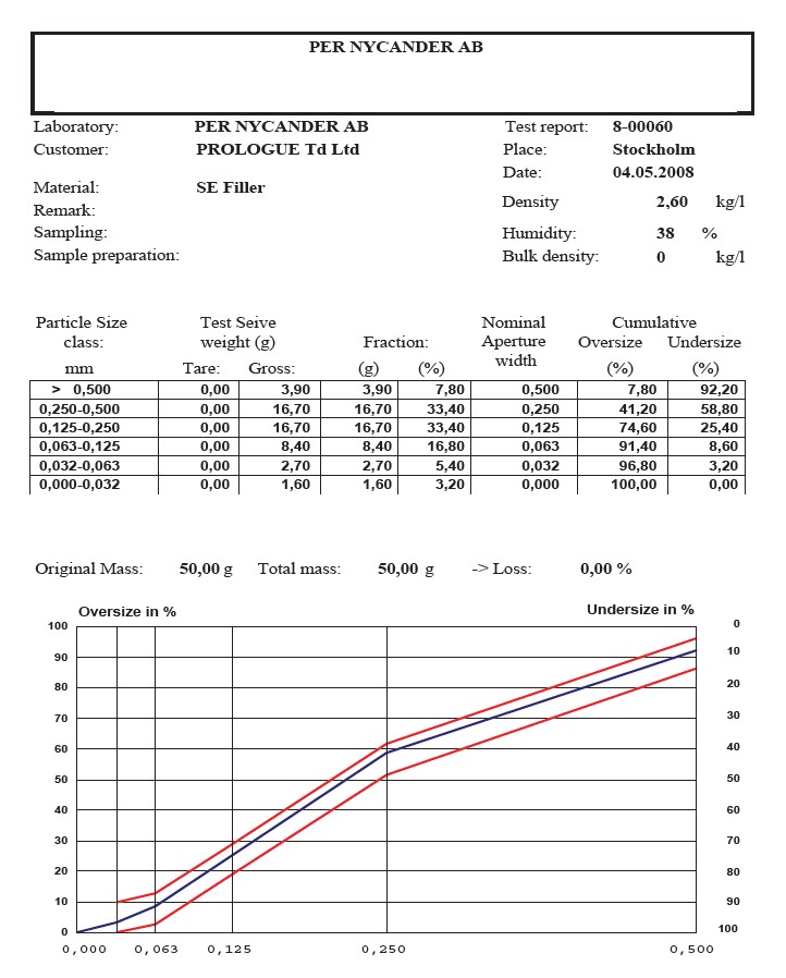 Vi säljer och producerar Forshammar filler refererad till i ovannämnda normer. Vi säljer i batcher om 10 kg som har ett individuellt siktanalyscertifikat med en mycket snäv siktkurva.