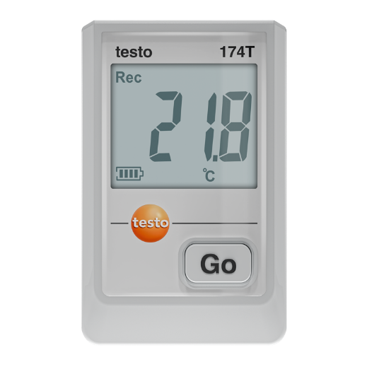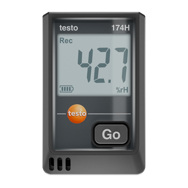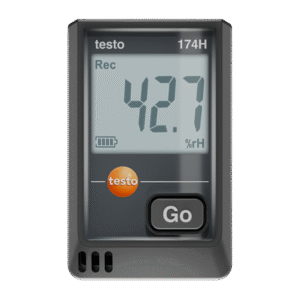 testo 174-H mini-datalogger, USB-interface, väggfäste, batterier (2 x CR 2032 litium) och fabriksprotokoll.