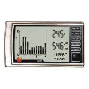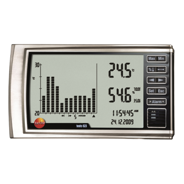 Hygrometern testo 623, batterier, fabriksprotokoll, väggfäste och bruksanvisning