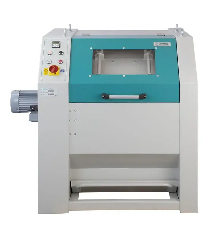 Består av ett massivt stålhölje med säkerhetslock och integrerad Los-Angelestrumma, roterad runt sin horisontella axel med 32 1/mini Inkl. automatisk räknare som stoppar maskinen efter att ha uppnått önskat antal rotationer. För att tömma trumman kan en lämplig bricka tillhandahållas.
