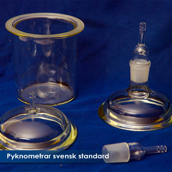 Glaspyknometrar för EN-standarden kommer i storlekarna 500 – 1000 – 2000 ml, och har en inslipad propp (hals).