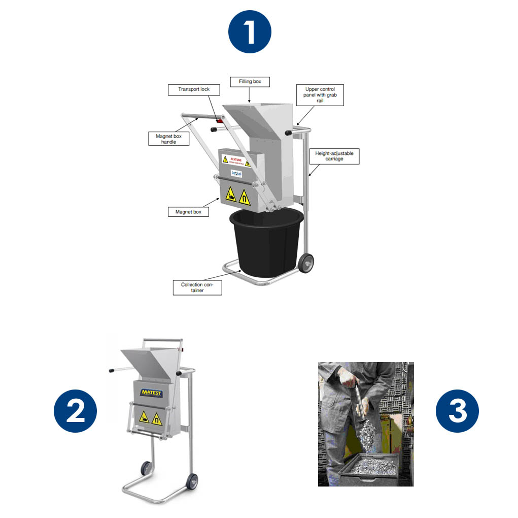 Tack vare högpresterande magneter tillåter denna enhet separering av metallfibrerna och bestämmer deras kvantitet i betongblandningen. Levereras utan uppsamlingshink.