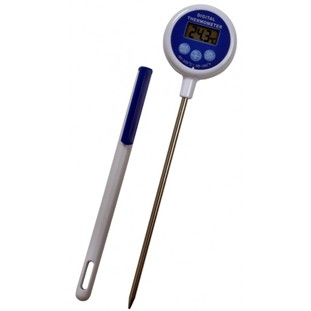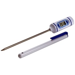 Temperaturområde: -49.9 till 149.9°C, Avläsning: 0.1 °C, Noggrannhet: ±1 °C, Sond Ø3.5 x 120mm i rostfrittstål. Väljbart att visa °C/°F samt holdfunktion. Termometern levereras med hylsa med clip.